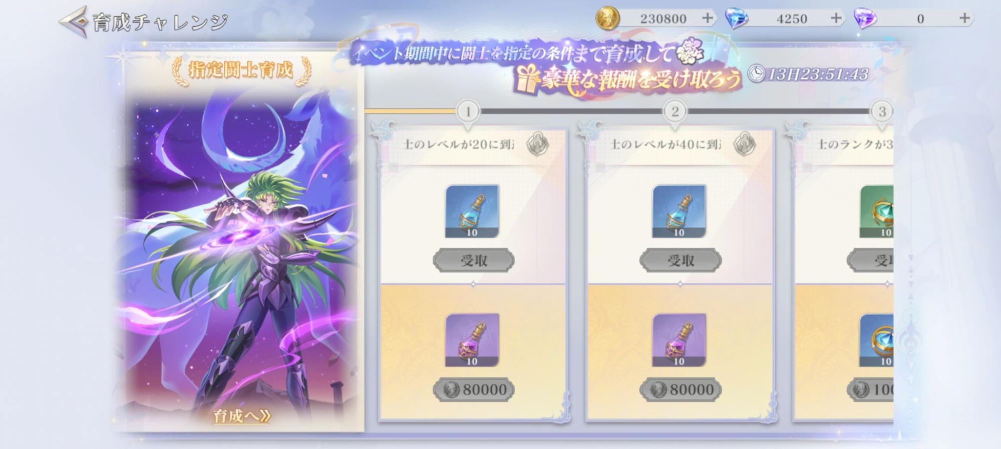 イベント期間中、闘士「冥衣・シオン」を指定の条件まで育成すると、豪華報酬を受け取れます!
