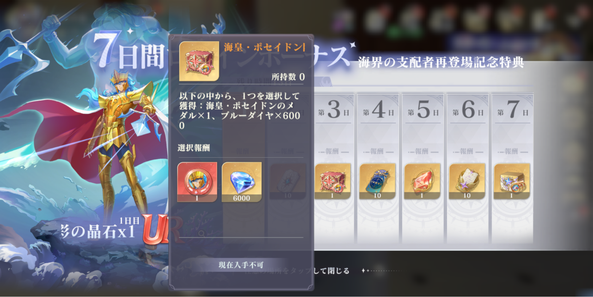 期間中、「海界の支配者再登場記念特典」にて、指定の日数をログインするだけで最大「海皇・ポセイドンのメダル×1」をもらえます。