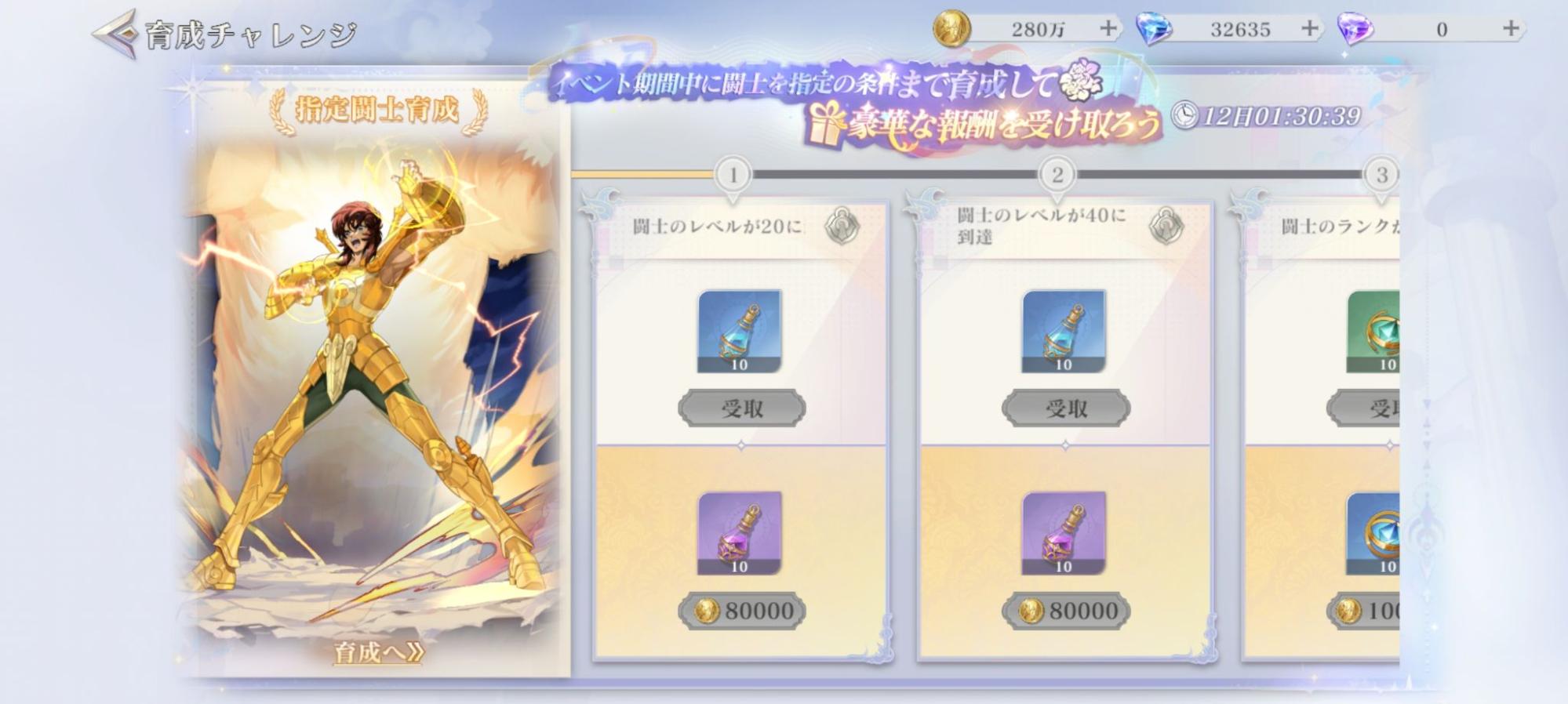 イベント期間中、闘士「天秤座・童虎」を指定の条件まで育成すると、豪華報酬を受け取れます!